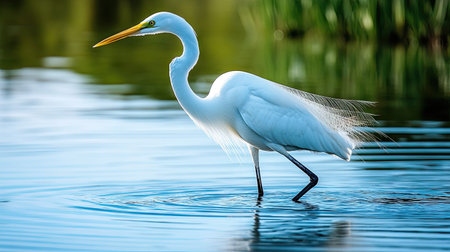 A high-resolution image captures a Great Egret wading in a pristine wetland stream, surrounded by lush aquatic plants This symbolizes thriving biodiversity and restored habitats Perfect for wildlife photography, documentaries, and educational materials on wetland restoration, showcasing nature's renewal and conservation efforts AI Generative