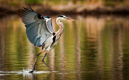 Elegant heron captured by the water against fiery autumn backdrop, showcasing wildlife beauty. A.I.