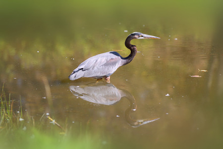 Cocoi Heron, Ardea cocoi, standing in a shallow lake by the shoreline and his reflection in the water.