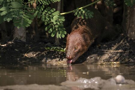 Image of Small asian mongoose(Herpestes javanicus) eating water in a pond on nature background. Wild animals. Animals.