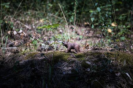 Brown bear walking in forest. Mini bear figure (or toy bear) at the park. Selective focus