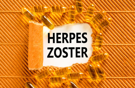 Herpes zoster symbol. Concept words Herpes zoster on beautiful white paper. Yellow pills tablets. Beautiful brown background. Medical healthy lifestyle herpes zoster concept.