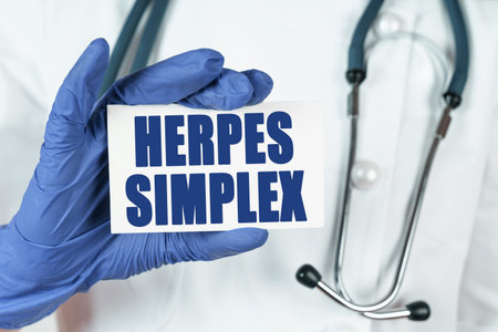 Medicine concept. The doctor holds a business card that says - HERPES SIMPLEX