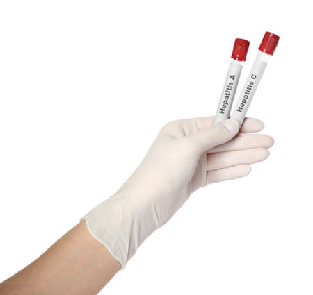 Scientist holding tubes with blood samples for hepatitis virus test on white background, closeup