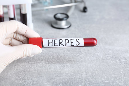 Doctor in glove holding test tube with word Herpes at gray table, closeup