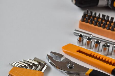 A set of tools for construction and repair, lying on a white background from the top view.