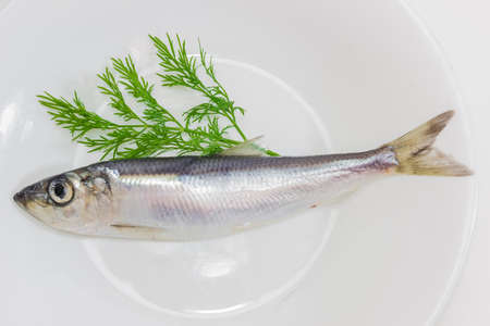 One raw sprat and a branch of a fresh dill on a white plate