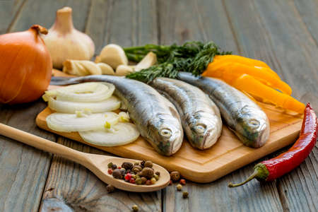 Herring fish and spices on gray wooden background