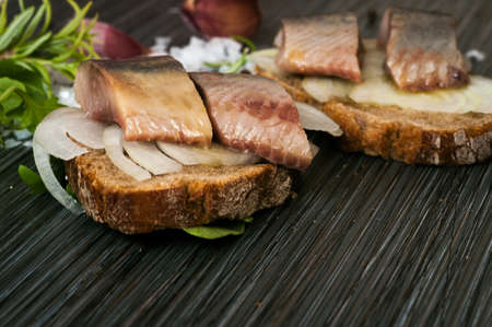 pieces of delicious herring on black bread on the table with greens