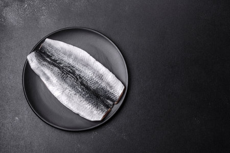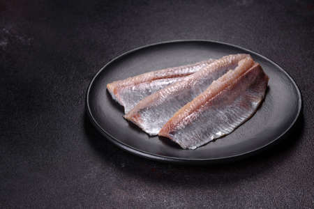 Delicious fresh herring fillet with salt, spices and herbs on a black plate against a dark concrete background
