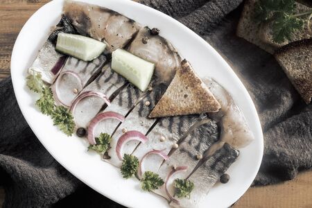 On a wooden table on a napkin plate with slices of salted mackerel, onions, cucumbers, parsley and a piece of bread. Top view.