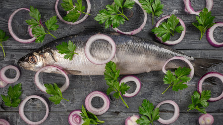 Fresh Herring With Onion Rings and Parsley on Rustic Wooden Background