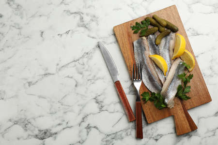 Salted herring fillets served with pickles, parsley and lemon on white marble table, flat lay. Space for text