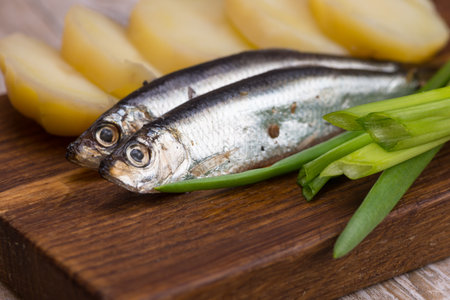 spicy salted anchovies, onions and boiled potatoes on a wooden board