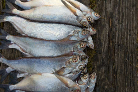 Good catch. Saberfish (Pelecus cultratus). Silver fish lie on an old moss-covered catwalk (duckrun, old wooden pier).
