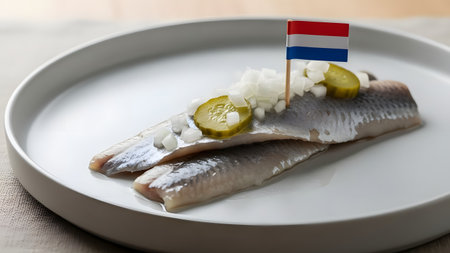 A traditional Dutch herring dish, known as Hollandse Nieuwe, served with chopped onions and pickles. A small Dutch flag toothpick garnishes the raw fish delicacy, presented on a white plate.