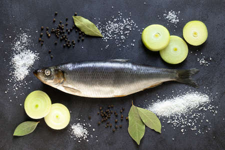 Herring fish with spices onions, bay leaves, salt, pepper on black background.