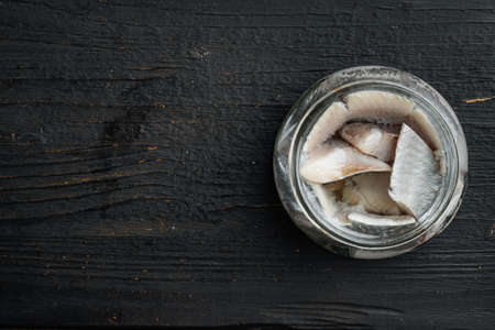 Canned Herring, fish preserves set, in glass jar, on black wooden table background, top view flat lay, with copyspace and space for text