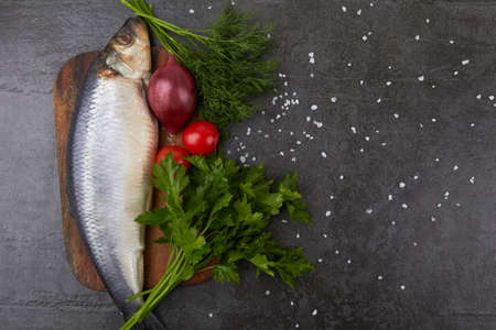 Salted herring with onion, peppers, sea salt and bay leaf on wooden board on dark gray background, Top view