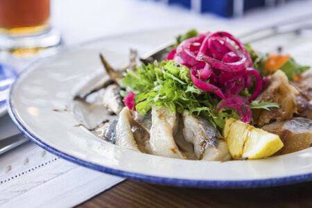 Plate of pieces of herring with fried potato and onion. Close up image with selective focus.