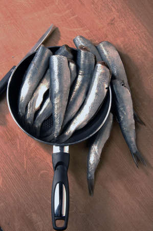 Step-by-step preparation of salted herring, step 2 - preparation of fresh herring for salting, top view, selective focus