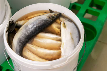 Herring in a plastic bucket in an industrial warehouse or store.