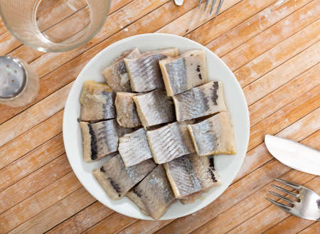 On table is plate with appetizer –salted Atlantic herring fillet