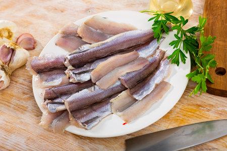 Marinated herring, sliced fish fillet on a plate with chopped onion and parsley on the table
