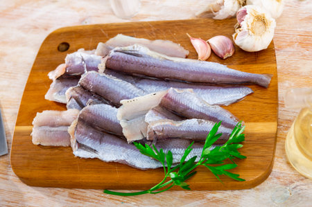 Salted boneless fillets of wild-caught Atlantic Herring arranged on natural black stone background. Clupea harengus.