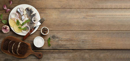 Sliced salted herring fillet served with basil, onion rings and lemon on wooden table, flat lay with space for text. banner design