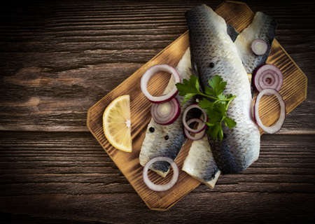 Fillet of Herring fish on wooden board with pepper, herbs, red onion and lemon on black background. Top view with copy space with potatoes