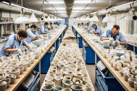 A technician in protective blue gloves meticulously arranges vivid ceramic cups on a high-speed conveyor, ensuring precision in a bustling quality assurance environm