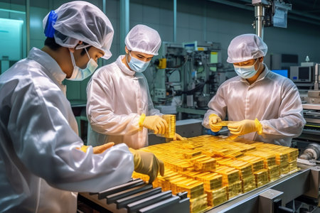 Generative AI workers and machinery in a solar panel manufacturing industry factory.