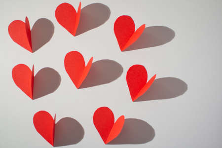 Hand made Red hearts on white background. Valentines Day flat lay.