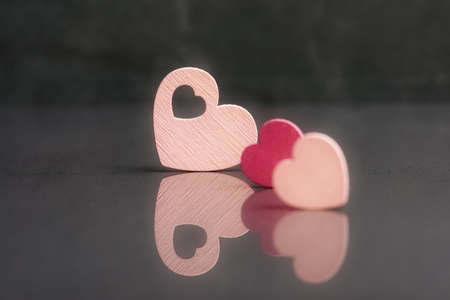Decorative hearts on grey background with reflection. Valentine’s day greeting
