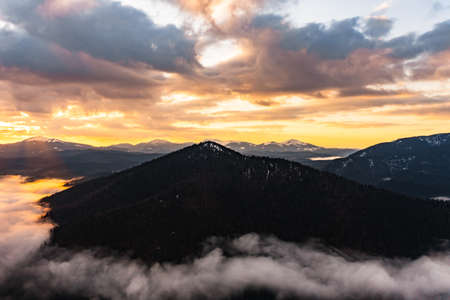 Aerial view of foggy evening over high peak with dark pine forest trees at bright sunset. Amazingl scenery of wild mountain woodland at dusk