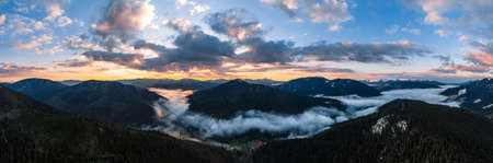 Panoramic view of sunset in scenic valley with beautiful nature landscape at autumn mountain with fog