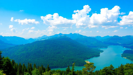 Mountain landscape with lake, forest and blue sky with clouds.