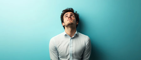 A young man in a light-colored shirt sits against a blue wall, looking upward thoughtfully. His expression reflects contemplation and introspection in a simple yet vibrant setting.