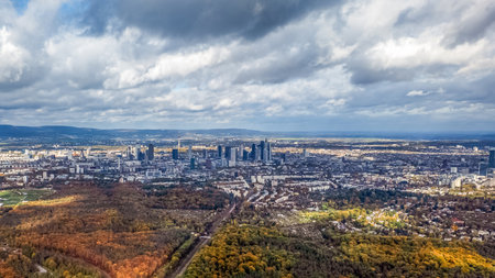 Close aerial view of Frankfurt city center and skyline with Taunus mountains and cloudy sky in background