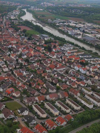 aerial view of town with houses and green fields, Germany