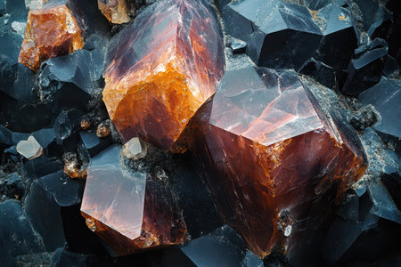 Clusters of shimmering orange and black crystals reflect light showcasing their sharp angles and faceted surfaces in a stunning display.