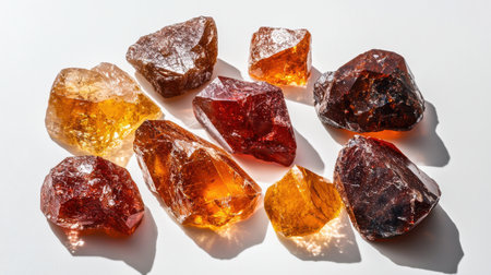 A collection of amber stones rests on a surface, illuminated by soft light. The rich hues range from deep orange to golden yellow, revealing intricate internal patterns.