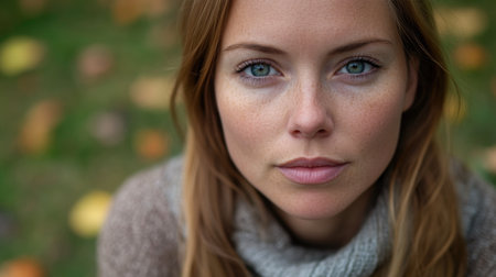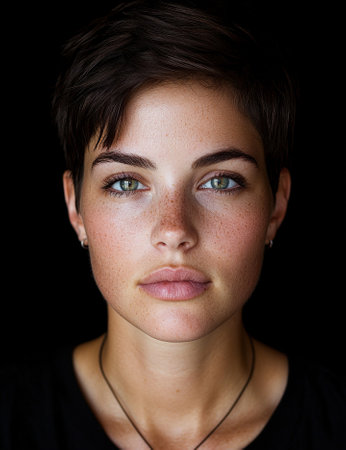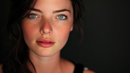 Captivating portrait of a young woman with striking green eyes and freckled skin