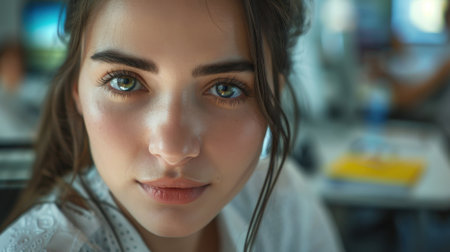 Close-up portrait of a beautiful young woman with green eyes.