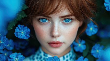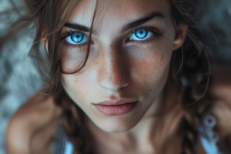 Close up portrait of a captivating young woman with freckles and mesmerizing blue eyes, creating a sense of intensity and beauty