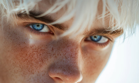 A portrait of a young albino, highlighting the unique beauty of his skin and hair, conveying individuality and strength of spirit.