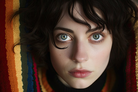 Portrait of a Young Woman with Striking Blue Eyes and Colorful Sweater