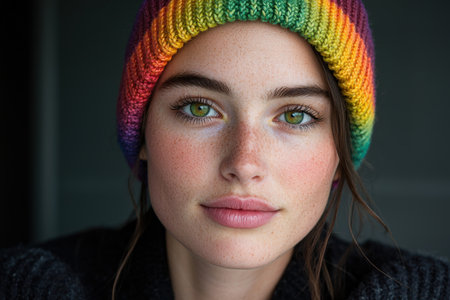 Vibrant portrait of a young woman with colorful knit hat
