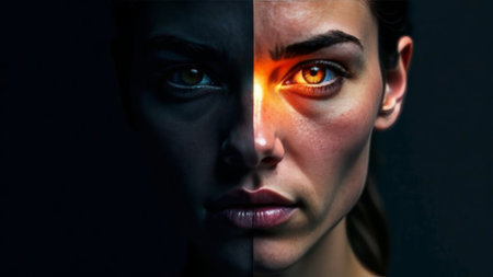 a face divided into two halves, symbolizing the contrast between good and evil, with one eye like a bright sun, emphasizing duality and intensity
